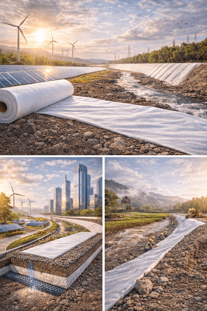Water Management: Waterproofing membranes, drainage canal filters, riverbank/dredger erosion control.